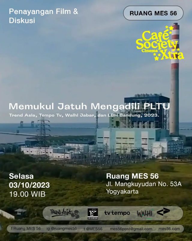 Selasa, 03 Oktober 202319.00 WIB Ruang MES 56Jl. Mangkuyudan No.53AYogyakarta Penayangan ini gratis & tanpa registrasi, silahkan datang langsung ke bioskop kami! “Memukul Jatuh Mengadili PLTU” | Trend Asia, TV Tempo, Walhi Jabar, dan LBH Bandung | 100 menit | 2023 Dokumentasi dari perjuangan warga Cirebon yang mempertahankan kesejahteraan kehidupan dan lingkungan mereka dari proyek… -