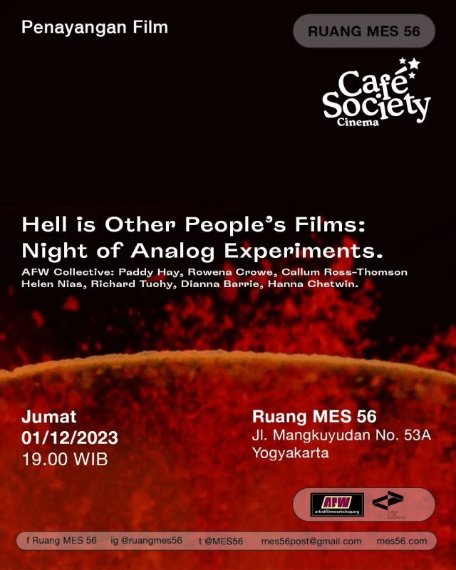 Cafe Society Cinema: Extra! Jumat, 01 Desember 2023.19.00 WIB. Ruang MES 56Jl. Mangkuyudan No.53AYogyakarta Artist Film Workshop bekerja sama dengan Cafe Society akan menampilkan film pendek eksperimental yang diproyeksikan dalam format 16mm. Film-film ini berasal dari laboratorium seniman Melbourne yang diciptakan secara manual dengan metode Do It Yourself (DIY). Selain itu, kami juga akan menampilkan… -