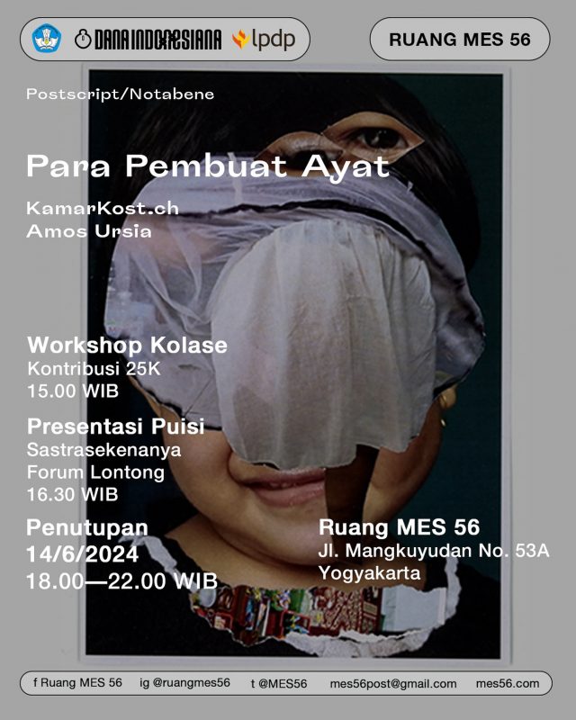 Jangan lewatkan kegiatan artist talk dari pameran Postscript/Notabene “Para Pembuat Ayat” oleh KamarKost dan Amos Ursia di Ruang MES 56. Sesi ini akan mendengarkan bagaimana pengalaman kolektif eksperimentasi visual KamarKost [Padang] yang telah menjalani proses tinggal bersama selama 9 bulan di dusun Tanjung di kaki gunung Merapi, Cangkringan. Pengalaman ini justru menjadi pengaruh besar atas… -