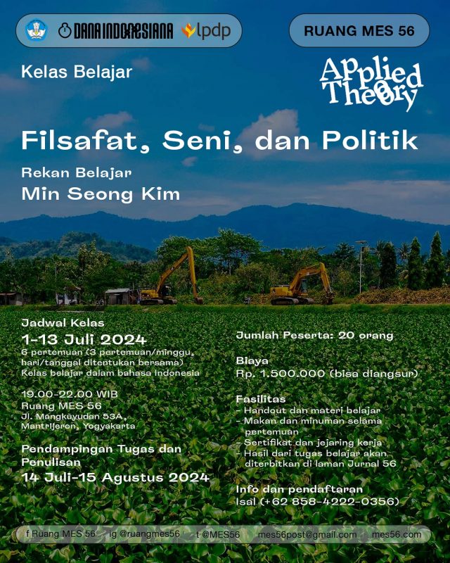 Applied Theory #1: Filsafat, Seni, dan Politik Untuk 20 Peserta!!! Kelas ini merupakan sebuah ruang belajar bersama untuk mengkaji pemikiran filsafat dan politik dalam kaitannya dengan wacana seni rupa kontemporer. Di dalam kelas ini, berbagai pemikiran akan dibentangkan–dari Walter Benjamin hingga politik estetika Rancierean–sebagai pijakan untuk membaca praktik seni rupa kita di Indonesia. Min Seong… -
